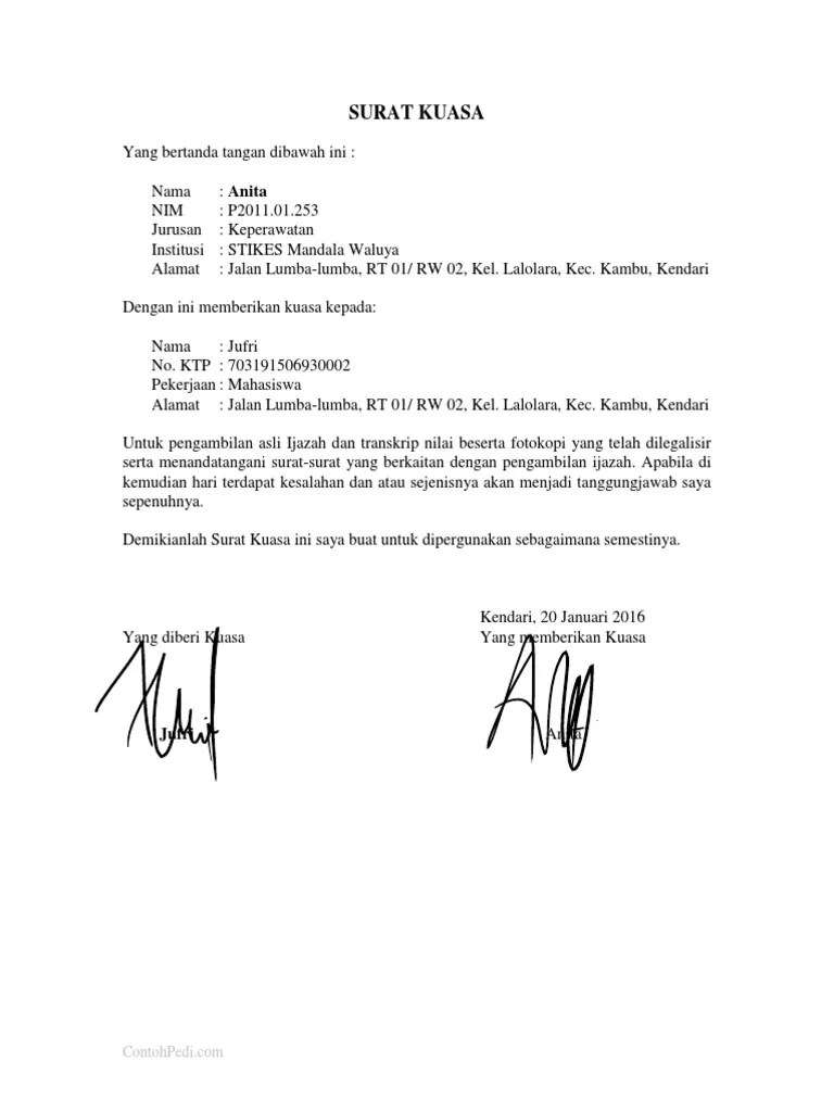 Nah langsung aja yuk simak artikel ini beserta. Surat kuasa digunakan untuk apa? Ada banyak contoh surat kuasa yang bisa menjadi referensi. Surat kuasa perseorangan adalah surat yang dibuat oleh seseorang kepada orang lain yang dipercayainya untuk melakukan suatu hal guna untuk kepentingan pribadi orang yang memberi kuasa. Ijazah biasanya baru bisa diberikan beberapa minggu atau bulan setelah mahasiswa di wisuda karena harus melalui proses legalisasi yang tentu.
