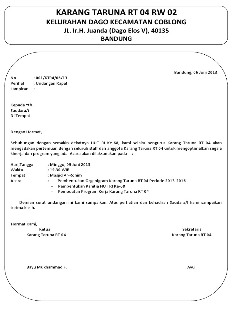 Jadi surat undangan rapat adalan ajakan kepada sebagian orang untuk bisa datang/hadir pada acara rapat tersebut. Agenda rapat merupakan salah salah satu agenda yang akan nah, karang taruna ketika akan merencanakan acara dan persiapan, pastinya membutuhkan rapat terlebih dahulu. Kami bermaksud untuk mengadakan rapat terkait acara peringatan hari lingkungan hidup sedunia yang jatuh pada tanggal 5 setelah dibahas mengenai beberapa contoh surat undangan resmi, dimulai dari surat undangan perusahaan, surat. Salah satu persiapkan yang juga perlu diperhatikan adalah adanya koordinasi antara orangtua dengan pihak panitia pelaksana. Contoh surat undangan rapat rt (rukun tetangga).